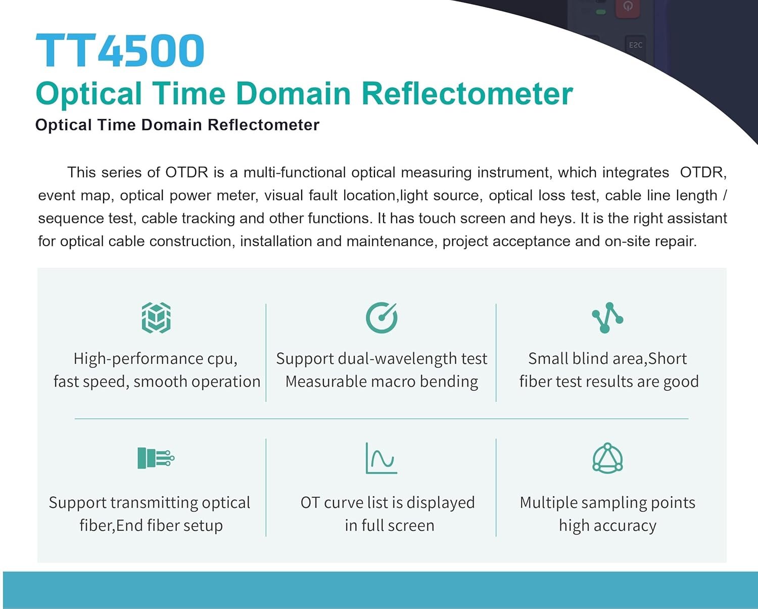 - Multi-functional Mini OTDR: Integrates functions such as Auto OTDR, Expert OTDR, Event Map, Optical Power Meter, Visual Fault Locator, Laser Source & RJ45 tester.